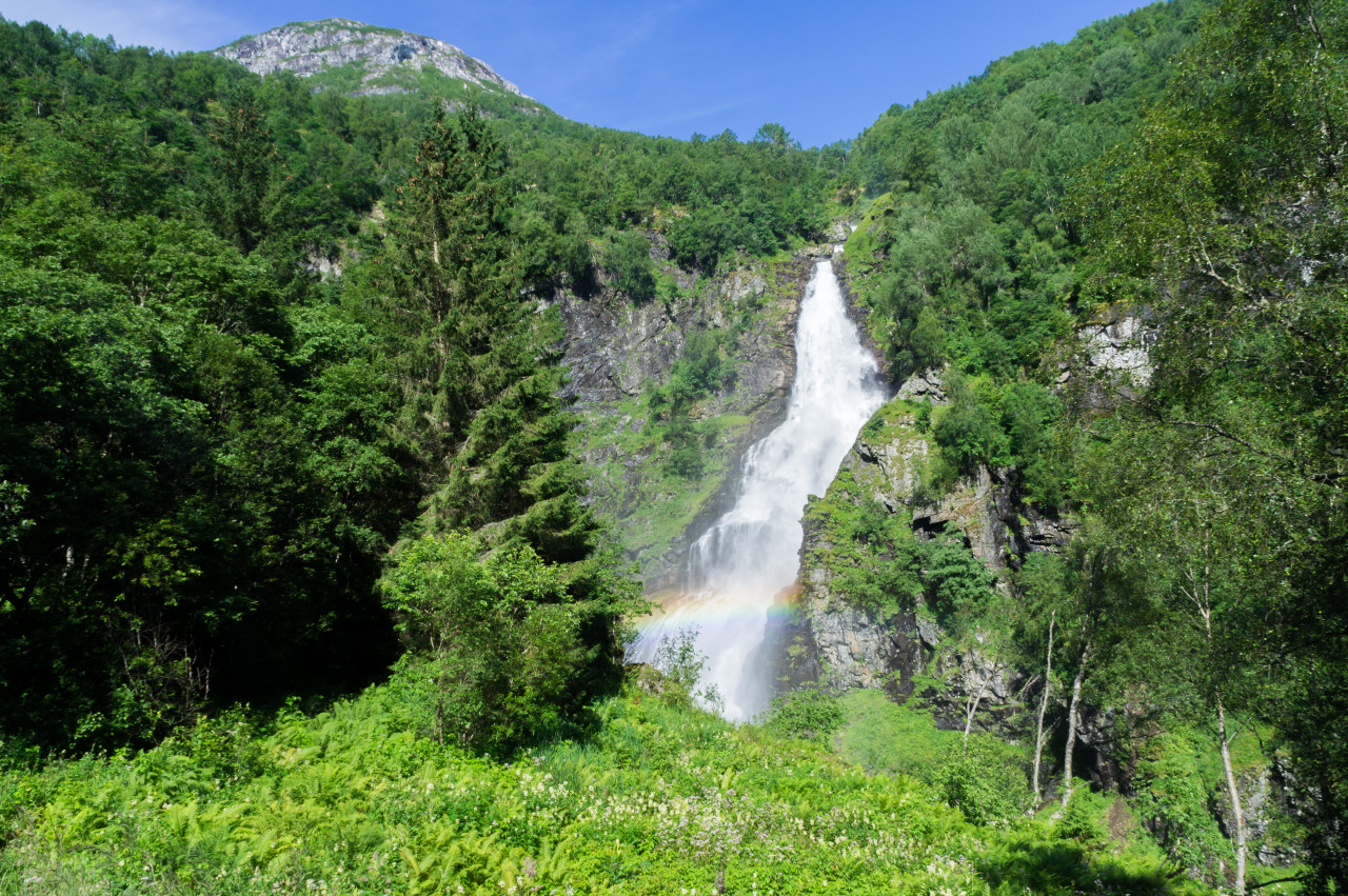 Este fiordo es uno de los más grandes de Noruega. Está bordeado por altas montañas, 1.800 m de altitud para la más alta. El barco desembarcó en Gudvangen. Una parada esencial antes de volver a Voss. Desde Voss, toma el tren a Bergen.